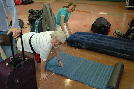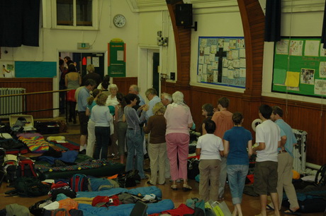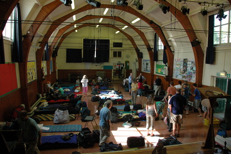 Pilgrims arrive at the hall and start to unpack and set up their beds.