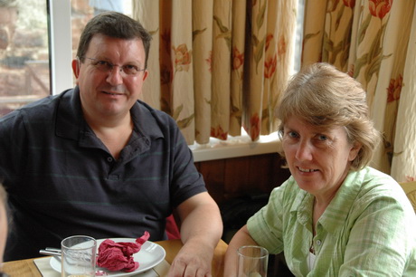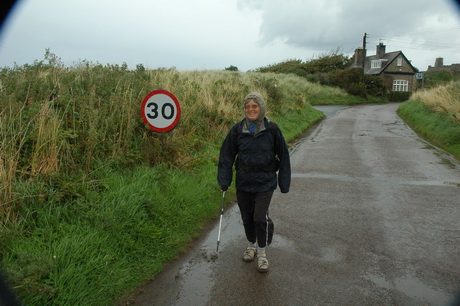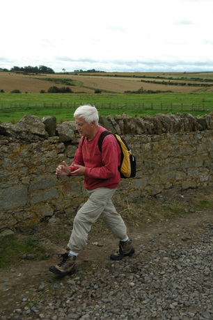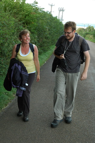 We followed the coast, with more good views, then climbed inland. Alison and Godwin chat as they walk.