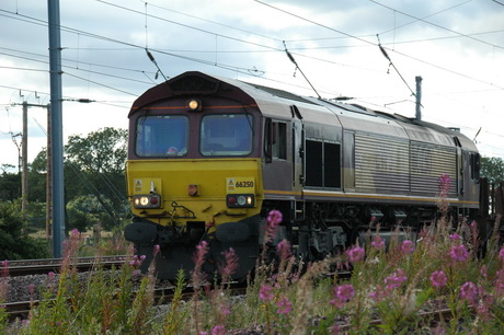 We waited for a goods train to pass (hauled by a General Motors Class 66 in EWS Livery (Now owned By German State Railways subsidiary DB Schenker))...