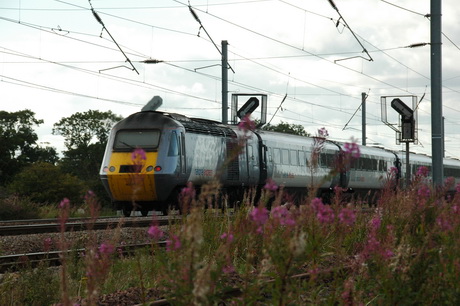 A passenger train hurries past. (Inter City 125 unit in National Express livery)
