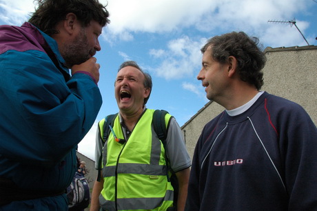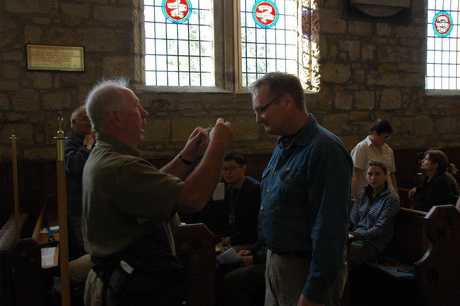 With Aidan out frontmarking, deputy Peter gives new pilgrim Stevie his cross.