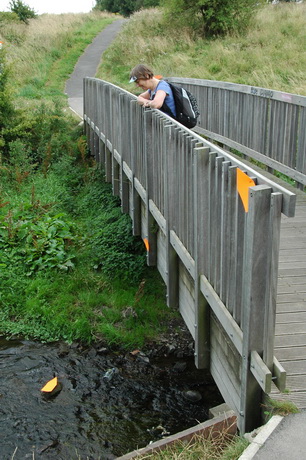 Lois studies a waterborne arrow. (This is the River Don footpath, where signs told us that voles might be seen).