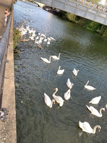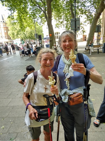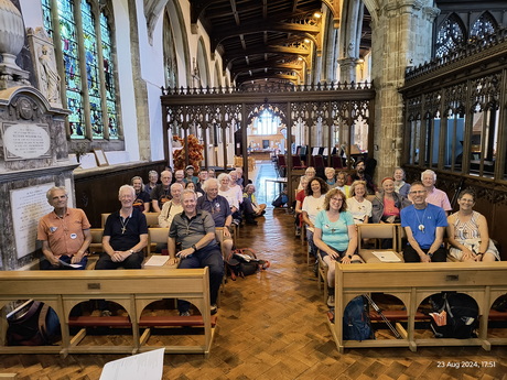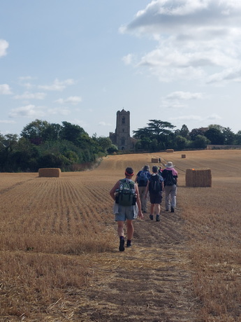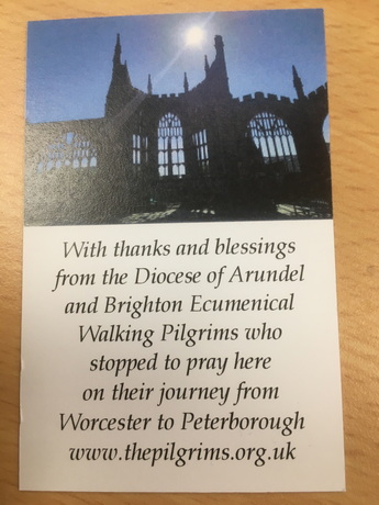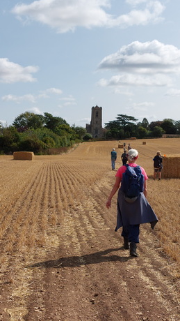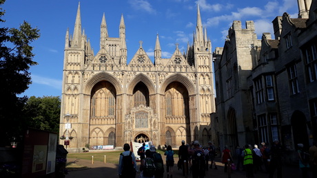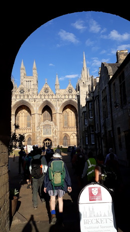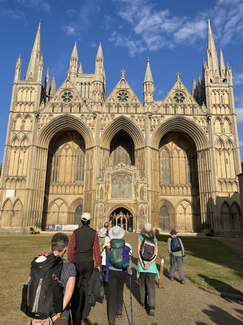 Today is a long day with an early start so that we can reach Peterborough in time for Evening Prayer. Those wanting a shorter walk can skip the first 4.5 miles by catching a bus to Barnack. We wander down through Stamford town centre to cross the River Welland then climb out of the town and go through the middle of Burghley Park, two weeks before its annual equestrian three day event takes place. Our two main prayer stops are at churches with splendid, ancient towers. Inside St John the Baptist in Barnack there is a sculpture of Christ in Majesty which may be 11th century, in which case it is the best-preserved Saxon sculpture in Britain, while St Kyneburgha in Castor is a grade-one listed building. Castor has Christian history going back to Roman times and St Kyneburgha established an abbey here in the 7th century. Her remains were later moved to Peterborough Cathedral where there is a side chapel dedicated to her. Accordingly Castor to Peterborough, which is just a short afternoon for us, is a recognised pilgrimage walking route in its own right, following a path alongside the River Nene. On arrival in Peterborough we attend the cathedral's evening prayer service but it takes place in St John the Baptist's Church as the cathedral is hosting an immersive exhibition "Monsters of the Deep". Following the service we process to the west door of the cathedral to mark reaching the end of the pilgrimage.