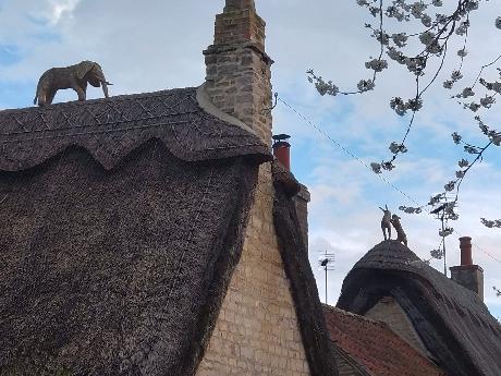 There's an elephant on the roof! Not to mention the hares. Cottages in Ailsworth. John Chenery