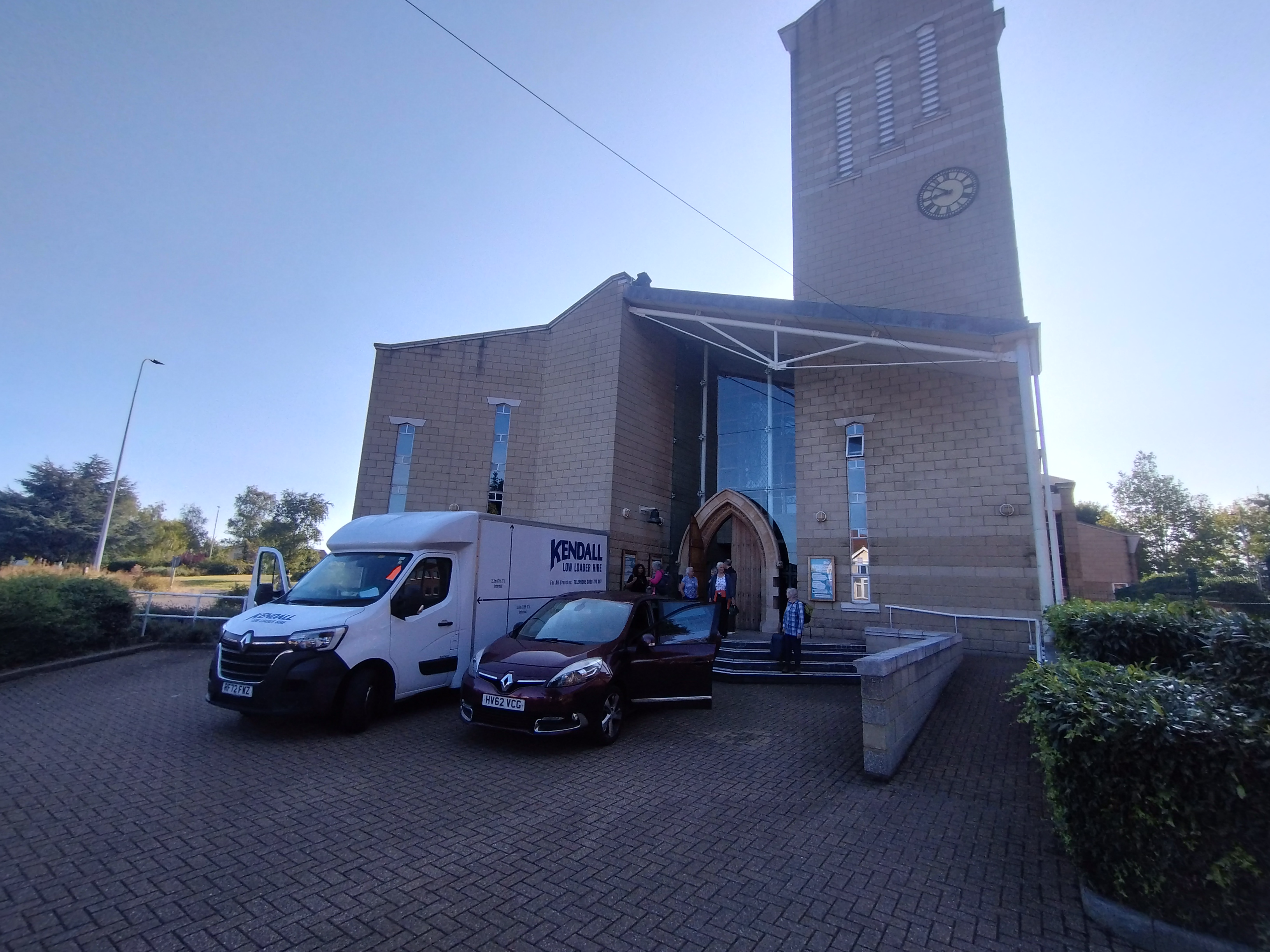 Pilgrims and vehicles outside St Mary, Peterborough, our home for the celebration day, but this is departure day. John Chenery