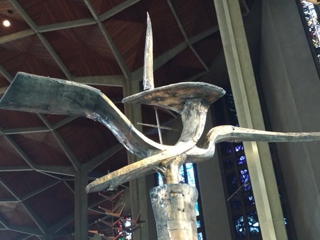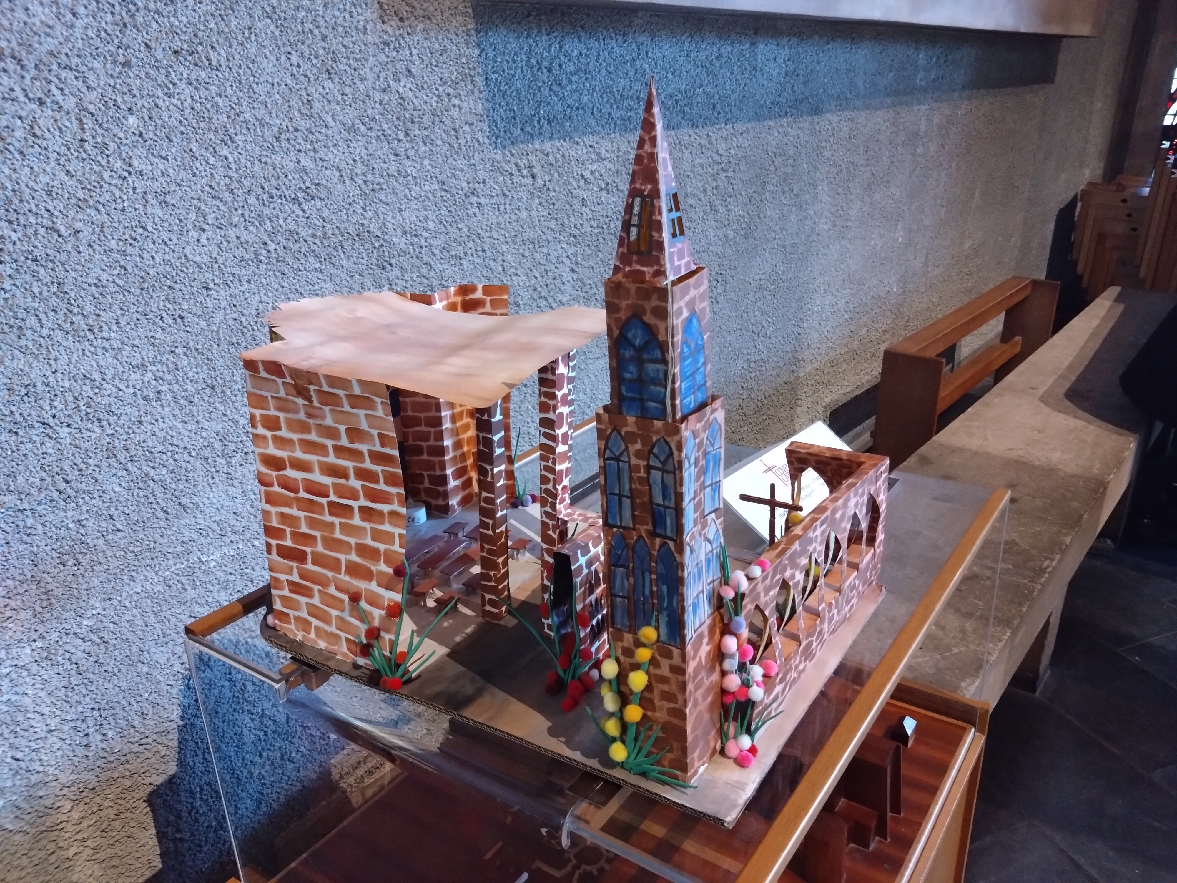 The Cross of Nails in the centre of a large cross sculpture at the main altar of the cathedral. The nails were found in the charred ruins. John Chenery