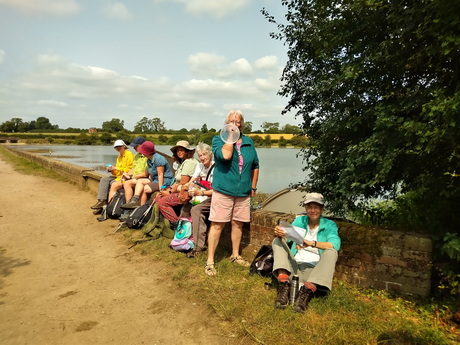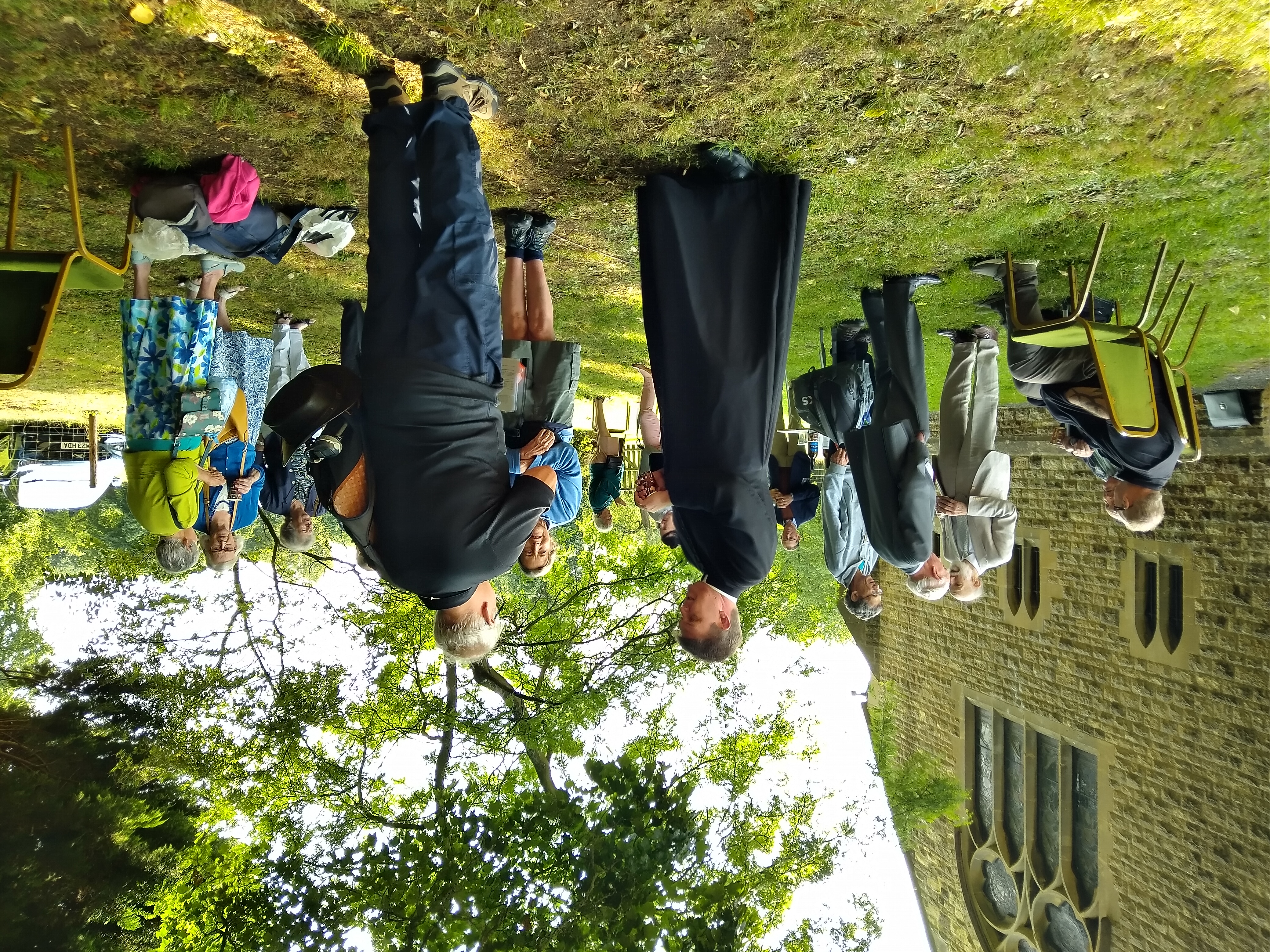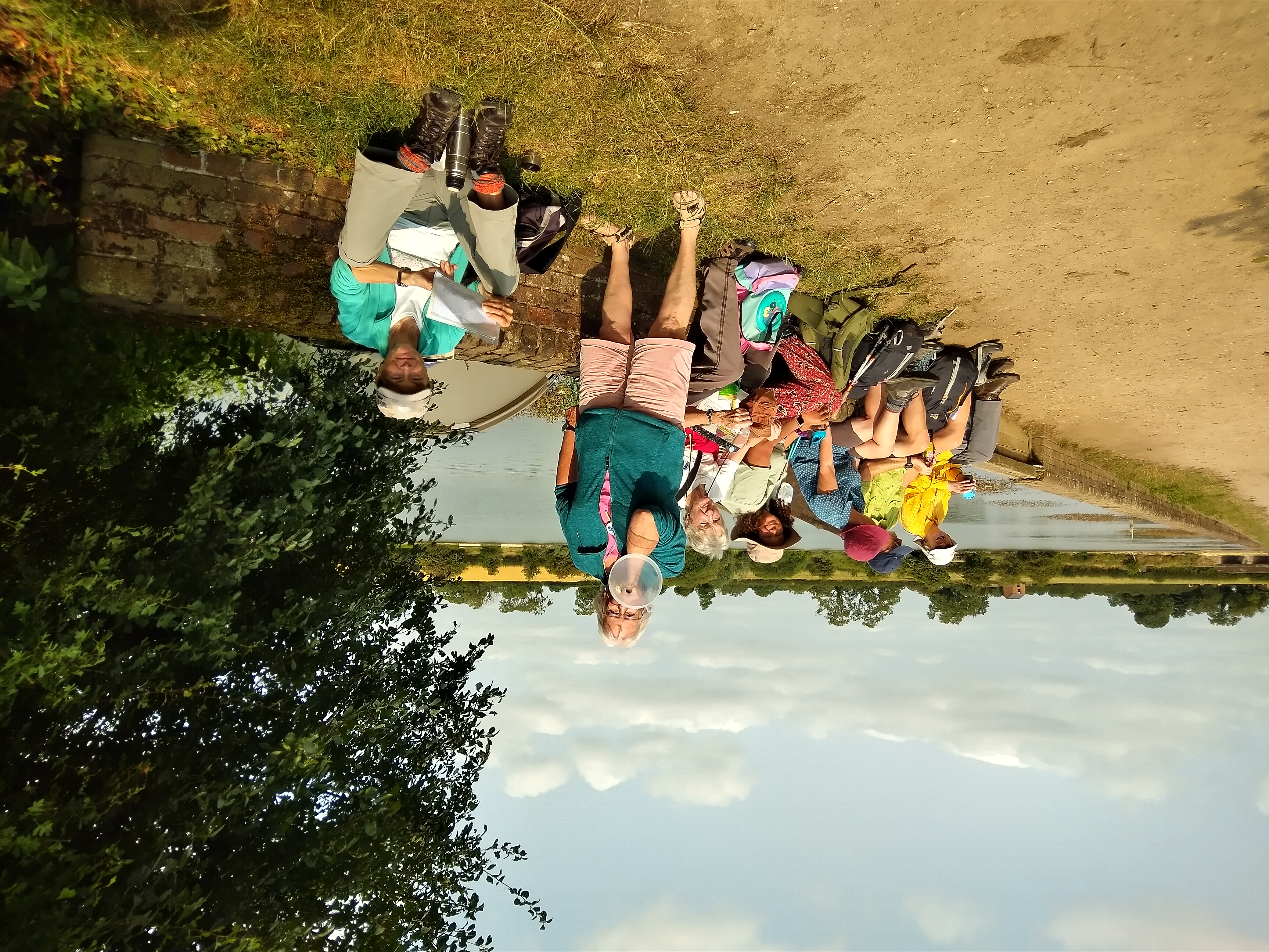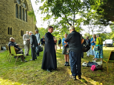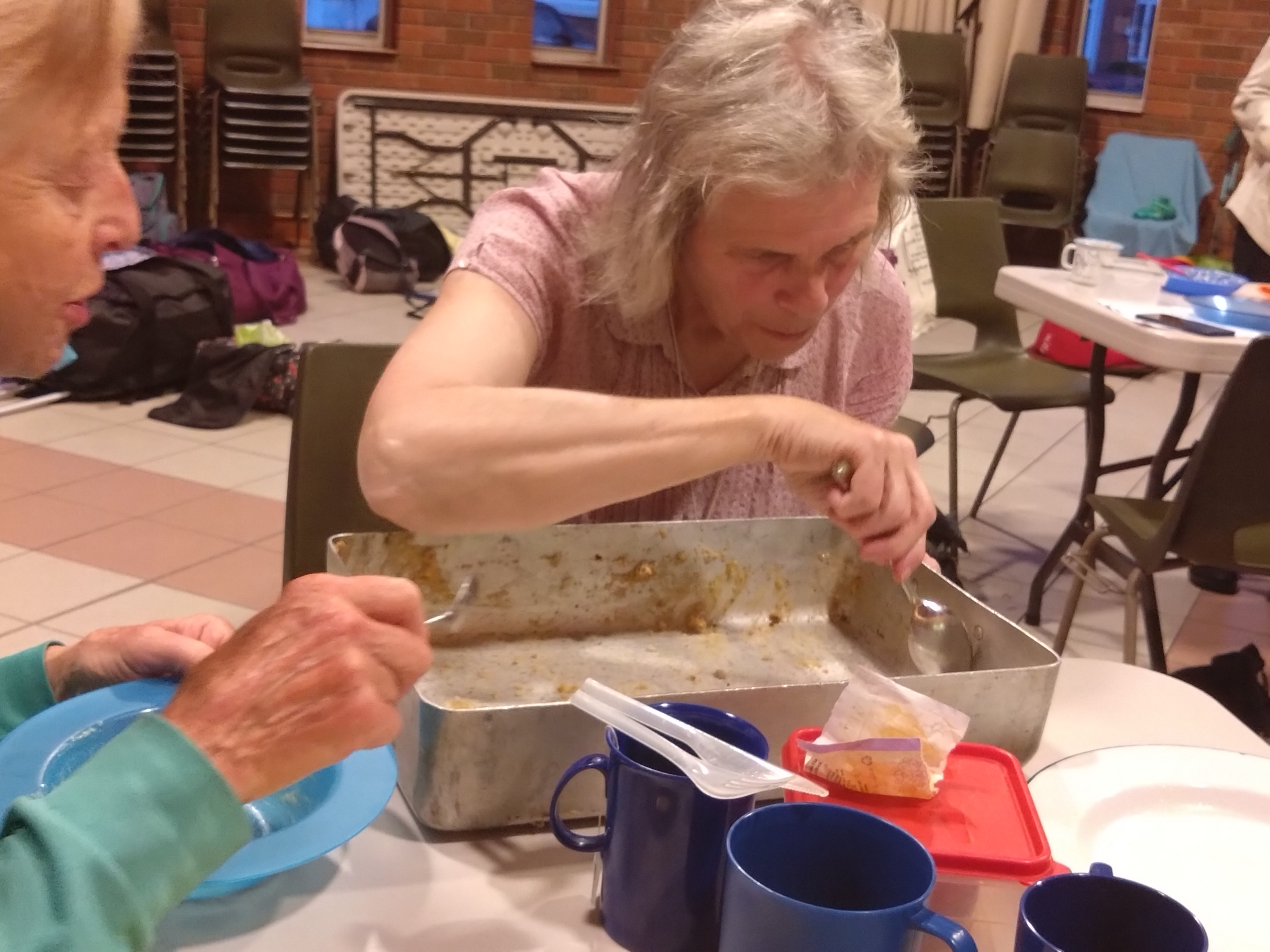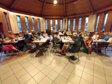 Pilgrims listening to evening announcements. Richard speaking about Tuesday's walk. John Chenery